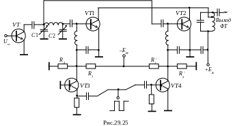 На рис.29.25 представлена одна из возможных схем осуществления ФТ с изменением фазы на 1800. Противофазные сигналы снимаются с выхода усилителя на транзисторе VT и поступают на входы транзисторов VT1 и VT2, которые подключаются к общему контуру. Подключение выходов транзисторов VT1 и VT2 к нагрузке осуществляется с помощью электронных ключей на транзисторах VT3 и VT4, управляемых от манипулятора, обеспечивающего последовательность импульсов противоположной полярности. При положительном импульсе с манипулятора на выход проходит высокочастотный сигнал через транзистор VT1, а при отрицательном сигнале с манипулятора на выход проходит высокочастотный сигнал с транзистора VT2.