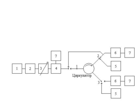 1 - генератор, 2 – развязывающий вентиль, 3 – аттенюатор, 4 – измерительная линия, 6 – детекторная секция, 7- индикатор.