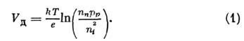 Обеднённый слой. Из-за большого градиентаконцентрации электронов ( п )и (обратного ему по знаку) градиентаконцентрации дырок ( р )в р - n -П. происходит диффузионноеперетекание электронов из п -об-ласти в р -область и дырокв обратном направлении. Его следствием является накопление избыточногоположит. заряда в n -области и отрицательного - в р -области(рис. 1). При этом появляется электрич. поле, направленное из n -областив р -область, действие к-рого на электроны и дырки (при термодинамич. <равновесии) компенсирует действие градиентов концентрации, т. е. диффузионныепотоки электронов и дырок уравновешиваются дрейфовыми потоками во внутреннемэлектрич. поле Е вн перехода. Поле Е вн обусловливаетдиффузионную разность потенциалов V Д (аналог контактнойразности потенциалов), величина к-рой (для невырожденных носителей)в р- и n -областях выражается ф-лой