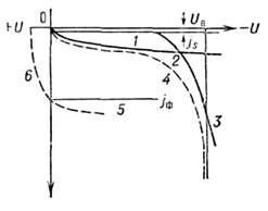 Рис. 4. Обратные токи р - п- перехода;1- тон термогенерации в квазинейтральных областях;2 - тонтермогенерации в обеднённом слое; 3 - ток туннельной генерации;4 - полный ток в отсутствие фотогенерации; 5 - - фототок j ф;6 - полный ток с учётом фототока.