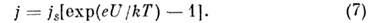 Если бы токам jns и jps не противостояли бы обратные противотоки, то через р- n -П. <проходил бы ток насыщения плотностью js = jns+ jps. Однако в отсутствие виеш. смещения токи неосновныхносителей jns и jps полностью компенсируютсятоками основных носителей (электронов из n -области и дырок из р -области),идущими в обратную сторону и равными, следовательно, также jns и j рs. Основные носители - дырки, переходящие из р -областив n -область, и электроны, идущие из n -области в р -область, <преодолевают на своём пути потенциальный барьер высотой V д и являются по своей природе термоэлектронной (термодырочной) эмиссией черезэтот барьер. Поэтому понижение барьера на величину U при прямомсмещении приводит к увеличению каждого из этих токов в exp(eU/kT )раз(см. Термоэлектронная эмиссия )и не вызывает изменения токов неосновныхносителей (для к-рых барьера нет). С учётом этого обстоятельства плотностьполного тока через р - п -П. можно выразить т. н. ф-лой Шокли (рис.3):