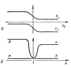 Рис. 2. Зонная диаграмма (н) и концентрацииэлектронов и дырок ( б) в области р - п -перехода;