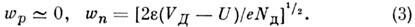 Здесь е - заряд электрона, Т- темп-pa полупроводника, ni - концентрация электроновв собств. полупроводнике, п п и р р - концентрацииэлектронов и дырок в п- и р -областях. Внутр. электрпч. полесосредоточено в обеднённом (запорном) слое р - n- П., где концентрацииносителей обоих типов меньше концентраций основных носителей в р -и n -областях вдали от перехода ( п<п п, р< р р),а мин. уровень суммарной концентрации электронов и дырок достигает значения( п+ р) мин= 2ni. Т. к. в обеднённомслое, как правило, разность концентрации свободных носителей мала по сравнениюс разностью концентраций ионизиров. доноров (N д) и акцепторов(Na), границы этого слоя с квазинейтральными р -и n -областями wp и wn могут бытьнайдены (после приближённого интегрирования Пуассона уравнения водномерном случае) из ф-л