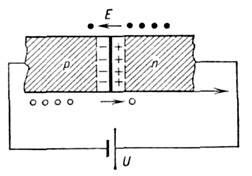 Внеш. напряжение U, приложенноек р - n -П., в зависимости от знака уменьшает (прямое смещение, <плюсы соответствуют р -области) или увеличивает (обратное смещение)напряжённость электрич. поля в обеднённом слое, сужая или расширяя егопри этом. Зависимость положения границ слоя wn, wp, от смещения U может быть найдена из ф-л (2),