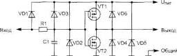 Цифровые микросхемы должны быть устойчивы к пробоям от статического или наведенного от силовых сетей электричества. Такая защита обеспечивается соответствующей структурой элемента. На рис. п3.1 видно, что такую защиту обеспечивают диоды VD1—VD6 и резистор R1, ограничивающий пиковый уровень тока зарядки конденсатора С1 в моменты скачков напряжения при переключении элемента. Диоды VD4—VD6 защищают выход инвертора от пробоя между р- и n-областями. Диод VD6 имеет пробивное напряжение 50 В, a VD4 — 25 В. Диод VD5 защищает канал от возможной ошибочной смены полярности напряжения питания.