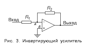 3. Воспользовавшись теперь правилом II, получим Uвых/R2 = -Uвх/R1, или коэффициент усиления по напряжению = Uвых/Uвх = R2/R1. Позже вы узнаете, что чаще всего точку B лучше заземлять не непосредственно, а через резистор. Однако сейчас это не имеет для вас значения.