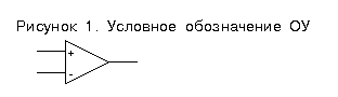 В большинстве случаев, рассматривая схемы с обратной связью, мы будем иметь дело с операционными усилителями. Операционный усилитель (ОУ) - это дифференциальный усилитель постоянного тока с очень большим коэффициентом усиления и несимметричным входом. Прообразом ОУ может служить классический дифференциальный усилитель с двумя входами и несимметричным выходом; правда, следует отметить, что реальные операционные усилители обладают значительно более высокими коэффициентами усиления (обычно порядка 105 - 106) и меньшими выходными импедансами, а также допускают изменение выходного сигнала почти в полном диапазоне питающего напряжения (обычно используют расщепленные источники питания ±15 В). Промышленность выпускает сейчас сотни типов операционных усилителей; условное обозначение, принятое для всех типов, представлено на рис. 1; входы обозначают (+) и (-), и работают они, как можно догадаться, следующим образом: выходной сигнал изменяется в положительном направлении, когда потенциал на входе (+) становится более положительным, чем потенциал на входе (-), и наоборот.