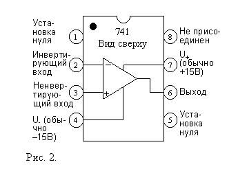 Точка на крышке корпуса и выемка на его торце служат для обозначения точки отсчета при нумерации выводов. В большинстве корпусов электронных схем нумерация выводов осуществляется в направлении против часовой стрелки со стороны крышки корпуса. Выводы "установка нуля" (или "баланс", "регулировка") служат для устранения небольшой асимметрии, возможной в операционном усилителе.
