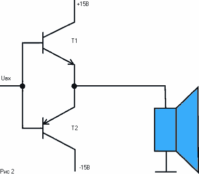 Резисторы смещения R переводят диоды в состояние проводимости, благодаря этому напряжение на базе Т1 превышает входное напряжение на величину падения напряжения на диоде. Аналогично и для Т2. Теперь, когда входной сигнал проходит через нуль, проводящим транзистором вместо Т1 становится Т2; один из выходных транзисторов всегда открыт.