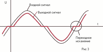 Схеме на Рис. 2 присуще следующее свойство: выходной сигнал отслеживает входной сигнал с разницей падения напряжения UБЭ; при положительном интервале входного сигнала выходное напряжение примерно на 0,6 В меньше, чем входное, а на отрицательном интервале - больше. Для синусоидального входного сигнала выходной сигнал будет таким, как показано на Рис. 3. Такое искажение называется переходным или типа "ступенька".
