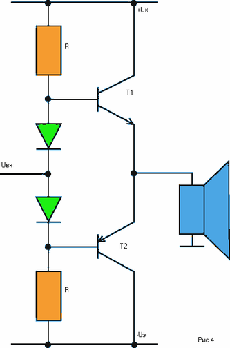 Для снижения переходного искажения двухтактный каскад смещают в состояние проводимости. На Рис. 4. показана самая простая схема смещения.