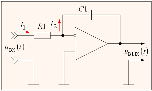 Интегрирующий усилитель получается в том случае, когда вместо резистора R1 в цепь обратной связи включен конденсатор С1 (рис. 3.56).