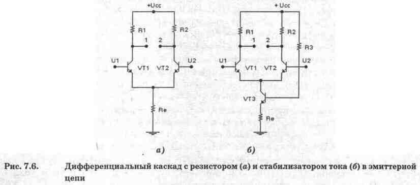 Дифференциальный усилитель (ДУ) является одним из основных каскадов операционного усилителя. Простейший ДУ (рис. 7.6, а) состоит из двух одинаковых плеч, каждое из которых содержит транзистор и резистор нагрузки. Эмиттеры транзисторов соединены между собой и через резистор Re подключены к общей шине.