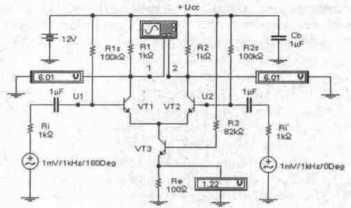 Если на оба входа подать одинаковые по уровню, но разные по фазе сигналы, то в результате ток одного транзистора увеличится, а другого на столько же уменьшится. В этом случае разность потенциалов между коллекторами будет пропорциональна удвоенному значению изменения напряжения на коллекторе транзисторов. При этом через резистор Re будет течь неизменный ток.
