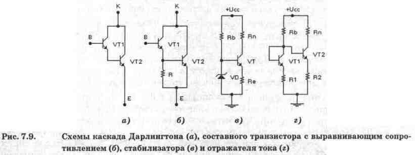 Каскад Дарлингтона (рис. 7.9, а) относится к классу так называемых составных транзисторов, обладающих такими свойствами, которые трудно или невозможно получить в транзисторах с обычной структурой. Особенностью каскада Дарлингтона является исключительно большой коэффициент усиления тока базы, равный [12]: B=Bi+B2+BiBz, где Вц Bz — коэффициенты усиления тока транзисторов VT1 и VT2. Во всех практических случаях первые два члена в правой части приведенного выражения не существенны и эквивалентный коэффициент усиления можно записать в виде В=В1Вг.