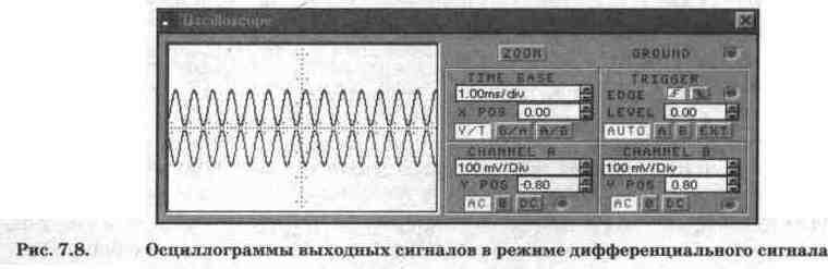 На рис. 7.8 показаны осциллограммы выходных сигналов схемы на рис. 7.7, откуда видно, что амплитуда выходного напряжения составляет около 75 мВ (напомним, что точное значение можно получить в режиме ZOOM), что соответствует эффективному значению 53 мВ. Поскольку эффективное значение входного сигнала равно 1 мВ, коэффициент усиления равен 53. Расчет по формуле (7.8) при выбранных параметрах транзисторов (Re'=5 Ом, Ri,'=10 Ом, к=0,99) дает значение около 65, т.е. получается несколько завышенный результат, что объясняется неидеальностью источника тока на транзисторе VT3.