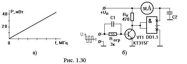 На рисунке 1.30,б приведена схема подключения приборов для снятия зависимости потребляемой микросхемой мощности в зависимости от частоты прямоугольных импульсов напряжения на входе элемента. Электронный ключ на транзисторе VT1 с ускоряющим конденсатором С1 позволяет получить импульсы необходимой амплитуды.
