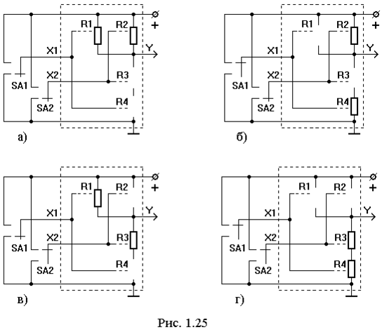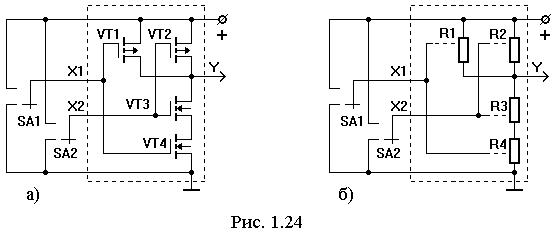 Рассмотрим схему логического элемента 2И-НЕ на микросхемах КМОП серии, приведенную на рисунке 1.24,а. При рассмотрении принципа работы логического элемента схему рисунка 1.24,а можно заменить эквивалентной схемой, приведенной на рисунке 1.24,б. На эквивалентной схеме сопротивления резисторов равны сопротивлениям между выводами сток-исток соответствующих полевых транзисторов.