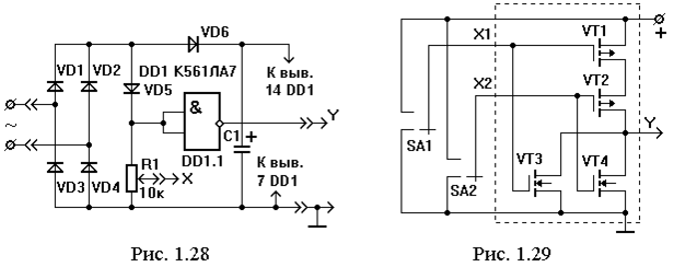 Выберем напряжение питания микросхемы 9 В. Пусть на входах Х1, Х2 действуют напряжения, соответствующие логическим нулям. В этом случае транзисторы VТ1,VТ2, будут открыты, а транзисторы VТ3, VТ4 закрыты. Эквивалентная схема для этого случая приведена на рисунке 1.25,а. Для закрытых транзисторов между выводами сток-исток на схеме показан разрыв электрической цепи, а для открытых транзисторов между указанными выводами сопротивление мало. Рассматривая делитель напряжения в цепи питания, приходим к выводу, что на выходе логического элемента будет напряжение логической единицы.
