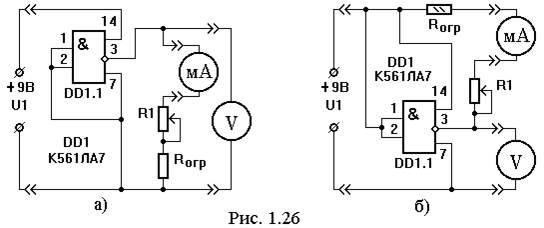 Для исследования зависимостей выходного напряжения от тока нагрузки для логических элементов КМОП используют те же схемы подключения приборов, что и для ТТЛ. Следует, однако, учитывать, что логические элементы КМОП не допускают короткого замыкания на выходе элемента в состоянии логической единицы. Для снятия зависимости выходного напряжения от тока нагрузки в состоянии логической единицы на выходе элемента собирают приборы по схеме, приведенной на рисунке 1.26,а. На рисунке 1.26,б приведена схема подключения приборов для снятия зависимости выходного напряжения от тока нагрузки в состоянии логического нуля на выходе элемента. Напряжение логической единицы и напряжение логического нуля зависят от выбранного напряжения питания логического элемента. При конструировании цифровых устройств необходимо в справочной литературе найти максимально допустимые токи нагрузки для используемых микросхем. Если таких данных нет, то рекомендуется не допускать напряжение логической единицы менее 0,9-0,8 от напряжения питания, а напряжение логического нуля - более 0,1-0,2 от напряжения питания.