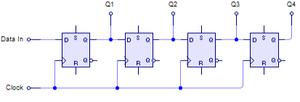 Сдвиговые регистры представляют собой последовательно соединённую цепочку триггеров. Основной режим работы — сдвиг разрядов кода от одного триггера к другому на каждый импульс тактового сигнала.
