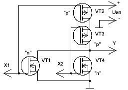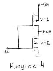 Однако более распространенными элементами на полевых транзисторах являются логические элементы КМОП - логики. Комплементарная МОП - пара имеет вид, представленный на рисунке 4.