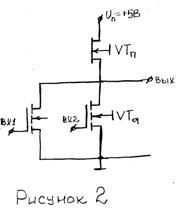 !--[endif]-->Функция ИЛИ-НЕ осуществляется по схеме, представленной на рисунке 2. Два отдельных затвора VT1 и VT2 обладают большой емкостью, что хуже, однако при таком построении обеспечивается большее быстродействие. Если хотя бы на одном входе напряжение равно логической единице, то на выходе напряжение соответствующее логическому нулю. Если на входе логический ноль, то тока через VT1 и VT2 не будет и на выходе получим логическую единицу.