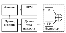 Структурная схема амплитудного пеленгатора, реализующего метод максимума (минимума) показана на рис. 5. Привод антенны связан с индикатором, в котором линия развертки перемещается синхронно с вращением антенны, образуя координатную шкалу. В момент нахождения РЭС в луче ДНА на экране индикатора формируется отметка в виде колокольного импульса или светящейся душки. Отсчет угла пеленга осуществляется оператором визуально по отклонению центра отметки от начала шкалы (при автоматическом съеме данных шкала представляет последовательность масштабных импульсов напряжения (меток), временной интервал между которыми соответствует определенному углу поворота антенны).