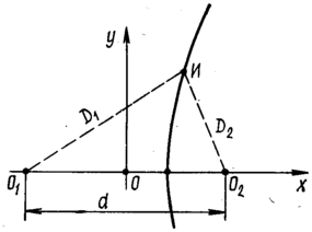 Если измеряемая величина есть разность дальностей D1, D2 от двух точек наблюдения О1 и О2 до источника ЭМИ (рис. 2), то линия положения – гипербола, а поверхность положения – гиперболоид вращения.