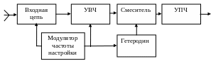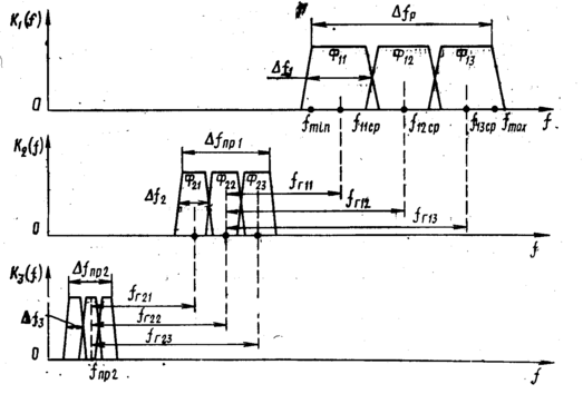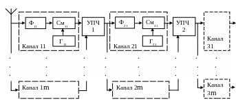 Сигналы, прошедшие через любой из фильтров, преобразуются гетеродинами первого столбца в сигналы первой промежуточной частоты, которые подводятся к первому усилителю УПЧ1, имеющему полосу пропускания DfПР1 = Df1. Если принятый сигнал частотой fC проходит через фильтр Ф1i, то после преобразования гетеродином Г1i частота сигнала будет лежать в пределах