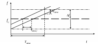 Поисковый способ определения fС заключается в последовательном по времени просмотре диапазона DfР. Механизм реализации способа показан на рис. 1, где DfПРМ – ширина полосы пропускания приемника станции РТР; ТПРМ – период перестройки частоты приемника; tПРМ f – время перестройки приемника на величину DfПРМ (время, в течение которого разведываемый сигнал может наблюдаться на выходе приемника).