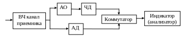 Если на вход разведывательного приемника поступает ЧМ-сигнал, то на выходе ЧД будет переменное напряжение, а на выходе АД – постоянное. При поступлении АМ-сигнала ситуация будет обратной. Коммутатор пропускает на выход только переменное напряжение, форму и параметры которого можно определить по изображению на экране индикатора или автоматически в специальном анализаторе.