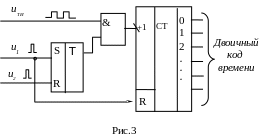 Схема измерителя (рис. 3) построена на преобразователе «время-код», который состоит из счетчика, управляемого R-S триггером и вентилем. Импульс u1 начала отсчета, формируемый дифференцирующей цепью по фронту входного импульса (рис. 4), обнуляет счетчик и переводит триггер в состояние Q=1. Этот сигнал разрешает прохождение через вентиль на вход счетчика тактовых импульсов, вырабатываемых высокостабильным генератором. Счет числа тактовых импульсов прекращается при поступлении импульса u2 конца отсчета, формируемого дифференцирующей цепью по срезу входного импульса.