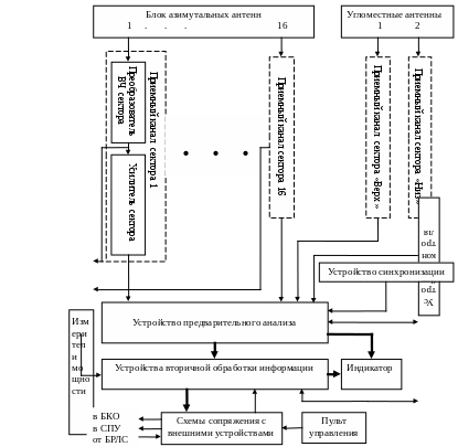 Первый этап (первичная обработка) осуществляется одновременно в 16-ти азимутальных и 2-х угломестных приемных каналах, каждый из которых состоит из преобразователя ВЧ и усилителя сектора. Выходные сигналы каналов подаются в устройство предварительного анализа и измерители мощности (только с азимутальных секторов).