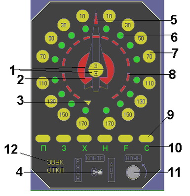 - желтые метки курсового угла (7), полусферы «Верх-Низ» (1) и типа (9) главной РЛС;