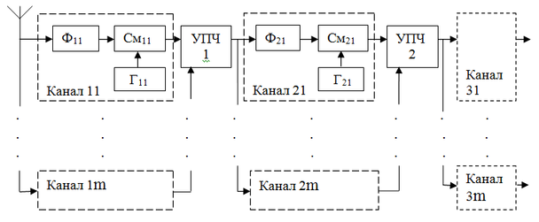 Сигналы, прошедшие через любой из фильтров, преобразуются гетеродинами первого столбца в сигналы первой промежуточной частоты, которые подводятся к первому усилителю УПЧ1, имеющему полосу пропускания DfПР1 = Df1. Если принятый сигнал частотой fC проходит через фильтр Ф1i, то после преобразования гетеродином Г1i частота сигнала будет лежать в пределах
