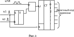 Схема измерителя (рис. 3) построена на преобразователе «время-код», который состоит из счетчика, управляемого R-S триггером и вентилем. Импульс u1 начала отсчета, формируемый дифференцирующей цепью по фронту входного импульса (рис. 4), обнуляет счетчик и переводит триггер в состояние Q=1. Этот сигнал разрешает прохождение через вентиль на вход счетчика тактовых импульсов, вырабатываемых высокостабильным генератором. Счет числа тактовых импульсов прекращается при поступлении импульса u2 конца отсчета, формируемого дифференцирующей цепью по срезу входного импульса.