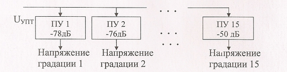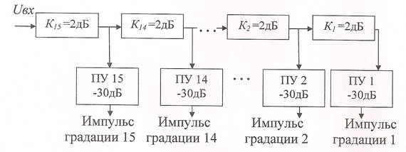 2) если мощность сигнала РUвх = -60дБ, то на выходе последнего каскада усилителя мощность составит РК1 = -60дБ +30дБ = -30дБ, т.е. ПУ1 выработает сигнал «Импульс градации 1»;