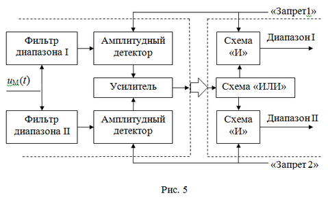 С выхода приемного канала сигнал («Н» или «И») поступает в устройство предварительного анализа, а с него – на логическую схему из элемента «ИЛИ» и двух элементов «И». Так как на вторые входы элементов «И» поступают сигналы запрета U31, U32, то каждый из этих элементов работает синфазно с соответствующим амплитудным детектором. В результате сигнал «Диапазон I» появится на выходе логической схемы, если сигнал uм(t) в ВЧ преобразователе прошел через фильтр диапазона I, а сигнал «Диапазон II» – если через фильтр диапазона II.
