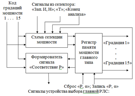 Если по результатам обработки сигналов очередного сектора в устройстве выбора происходит смена главной РЛС, то им вырабатывается импульс сброса «Р, α». При этом регистр памяти мощности главного типа обнуляется, а по импульсу записи «Р, α» из устройства выбора, информация из регистра хранения схемы селекции переписывается в регистр памяти мощности главного типа. Эта информация о мощности сигналов главной РЛС выдается в виде кода «Градация 1» - «Градация 15» в схему «Вычислитель времени» и далее на индикатор обстановки.