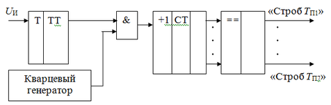 Схема измерителя периода TП построена на основе преобразователя «Время-код» и состоит из Т-триггера, логического элемента «И» (&), суммирующего счетчика СТ, схемы сравнения (= =) и кварцевого генератора (рис. 4).
