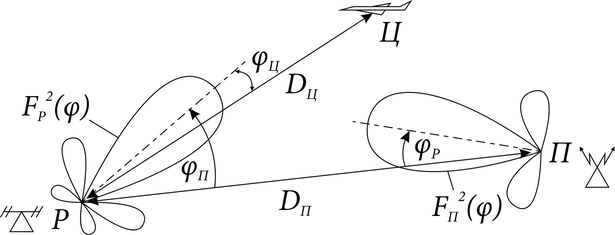 φП – угол между максимумом ДНА РЛС и передатчиком помех;