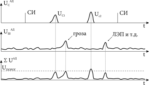 При формировании маскирующих помех РЛС ОНЦ (в случае достаточно равномерной спектральной плотности шума в пределах полосы пропускания УПЧ), на выходе АД формируется шумовая составляющая в течение всего периода наблюдения. При сохранении порогового значения увеличивается вероятность ложной тревоги. При стремлении сохранить WЛТ на допустимом уровне, за счёт повышения напряжения порога уменьшается вероятность правильного обнаружения WПО.