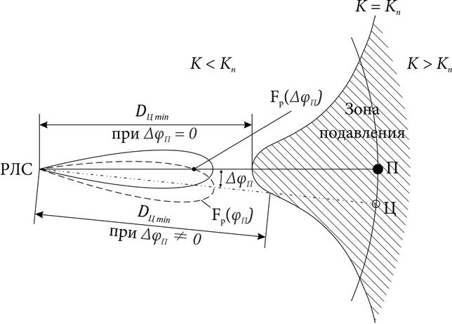 Рисунок 10. Зона подавления РЛС постановщика помех при DЦ = DП и ΔφП ≠ 0