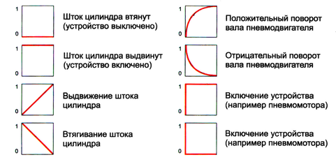 Диаграммы перемещений отображают в графическом виде состояния исполнительных механизмов — пневмоцилиндров, пневмодвигателей и т. п., а диаграммы управления — состояния информационных и управляющих устройств.
