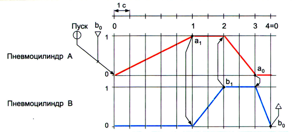 На диаграмме слева от каждой графической строки проставляют индекс устройства, изменение состояний которого она отображает (пневмоцилиндры А и В).