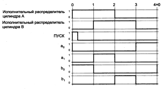 В состоянии 0 (исходном), когда штоки обоих цилиндров втянуты, активны путевые выключатели а 0 и b 0. Следовательно, команда на выполнение 1-го шага А + должна подаваться при наличии сигналов от двух названных устройств и кнопки «Пуск ». Таким образом, можно записать следующее логическое уравнение: