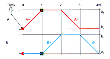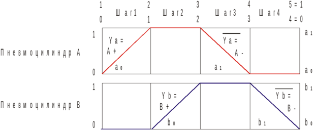 В правой части могут быть указаны индексы путевых выключателей, отслеживающих соответствующие состояния исполнительных механизмов а0, а1 b0, b1.
