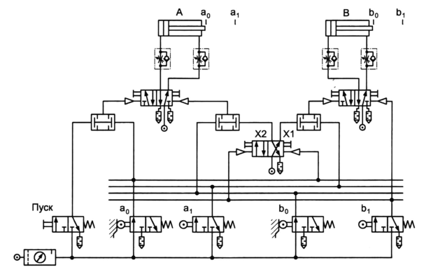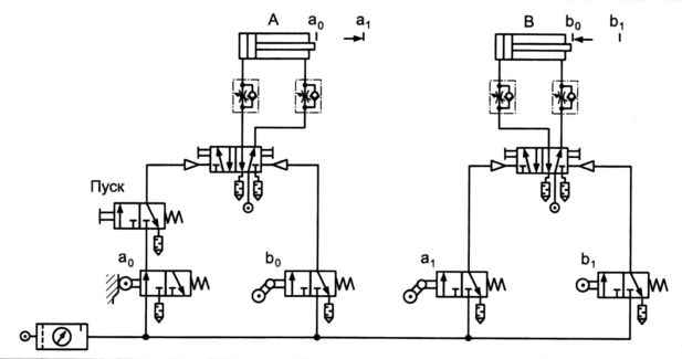 В полученной системе совпадающие уравнения отсутствуют. Однако следует обратить внимание на следующее: 2-ой шаг (B+) осуществляется по команде от путевого выключателя а1, который остается активным и на очередном, 3-ем, шаге (B-), выполняемом по команде от путевого выключателя b1 . Это означает, что на распределитель, управляющий цилиндром В, одновременно будут поданы два противоположных сигнала управления — от путевых выключателей а1, и b1 В таком случае, как известно, пневмораспределитель остается в позиции, определяемой первым из поступивших управляющих сигналов, следовательно, 3-й шаг (действие B -) выполняться не будет.