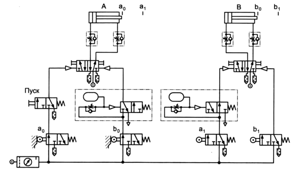 Рис. 1.16. Принципиальная пневматическая схема сверлильного полуавтомата с применением пневмоклапанов выдержки времени (формирователей импульса)